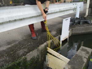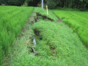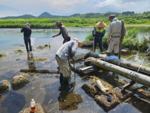 8月19日、本年度第2回目の標記揚水ポンプ場の浚渫作業が実施された。用水期前の前回6月の作業で入念な浚渫を行っていたこともあり、水槽内の堆積土砂は少なく、予定より短時間で終えることができた。業務に当たった水守人や地区関係者からは、「前回並みの作業を想定してきたが、暑い中だったので思いのほか短時間で済んでホッとした。」と猛暑の中、安堵の声が聞かれた。稲刈りまで台風等の上陸がないことを願いたい。(R7. 8.25記)